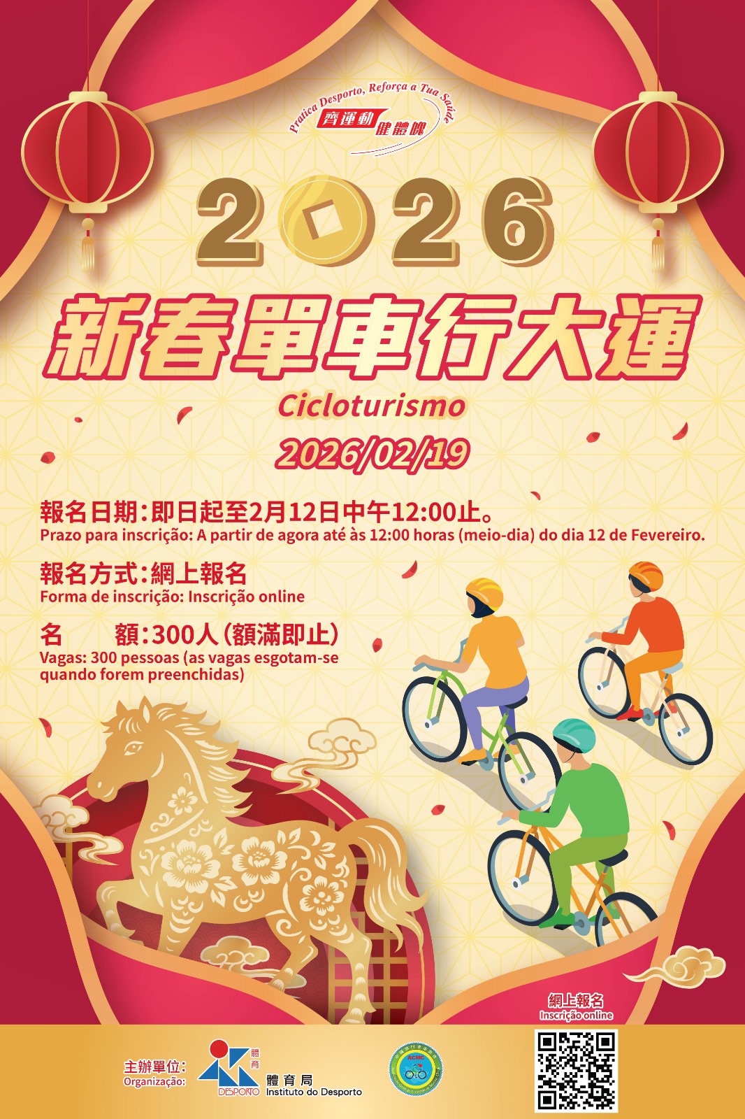為喜迎甲午馬年的來臨,體育局將於農曆正月初三(2月19日)及初六(2月22日)深入社區舉辦「2026賀歲康體活動」,系列活動包括「新春單車行大運」、「新春康體嘉年華」及「新春電單車及經典車大巡遊」,歡迎全澳市民及旅客踴躍參與。活動內容豐富,尤其適合家庭親子同樂,讓大家在歡度佳節的同時,也能透過多元化的康體活動鍛鍊身心。
