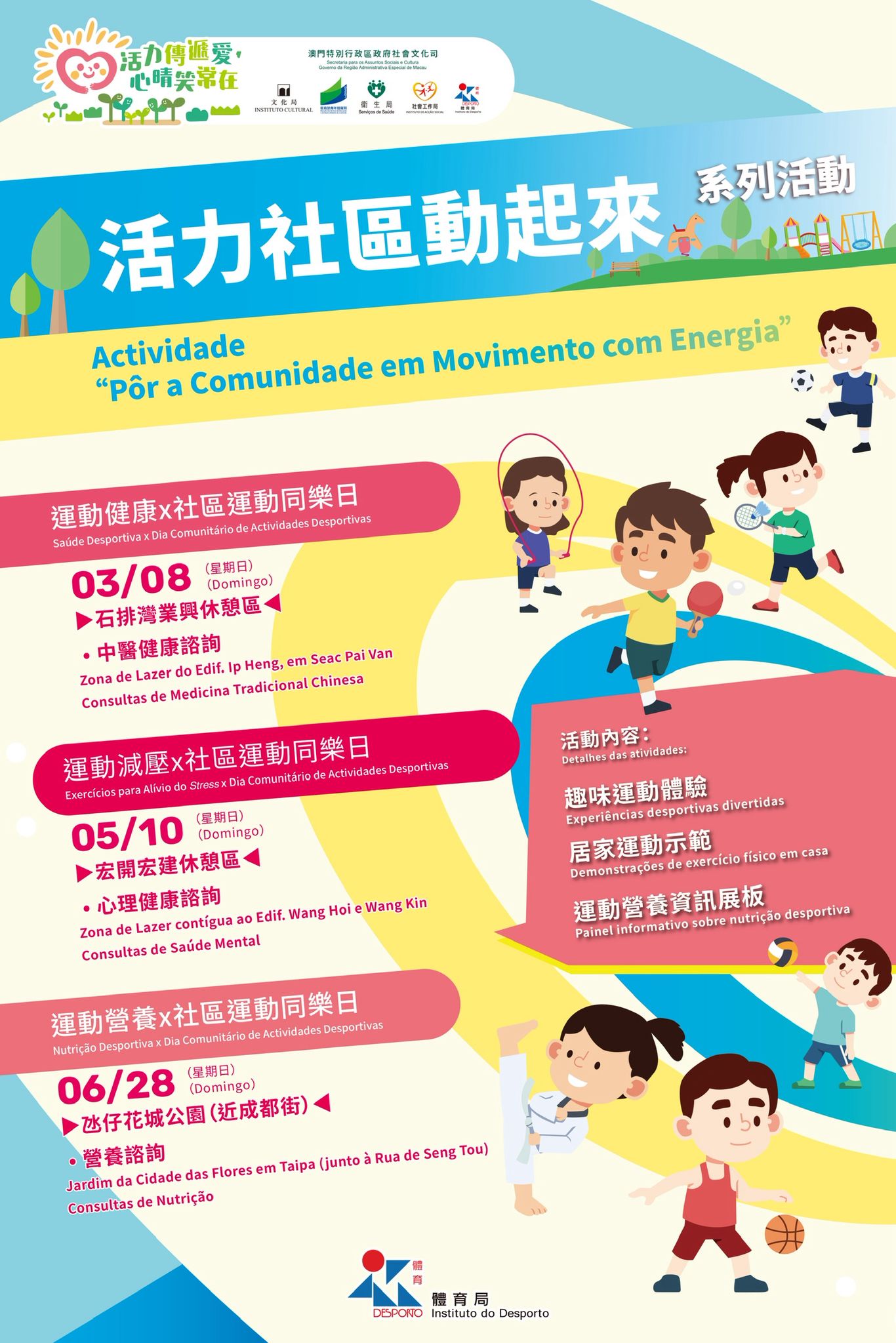 為配合特區政府資源下沉社區的施政方針,體育局將於本年3月至6月期間舉辦「活力社區動起來」系列活動,透過深入社區,為區內市民提供參與體育運動的途徑,鼓勵居民積極參與運動。