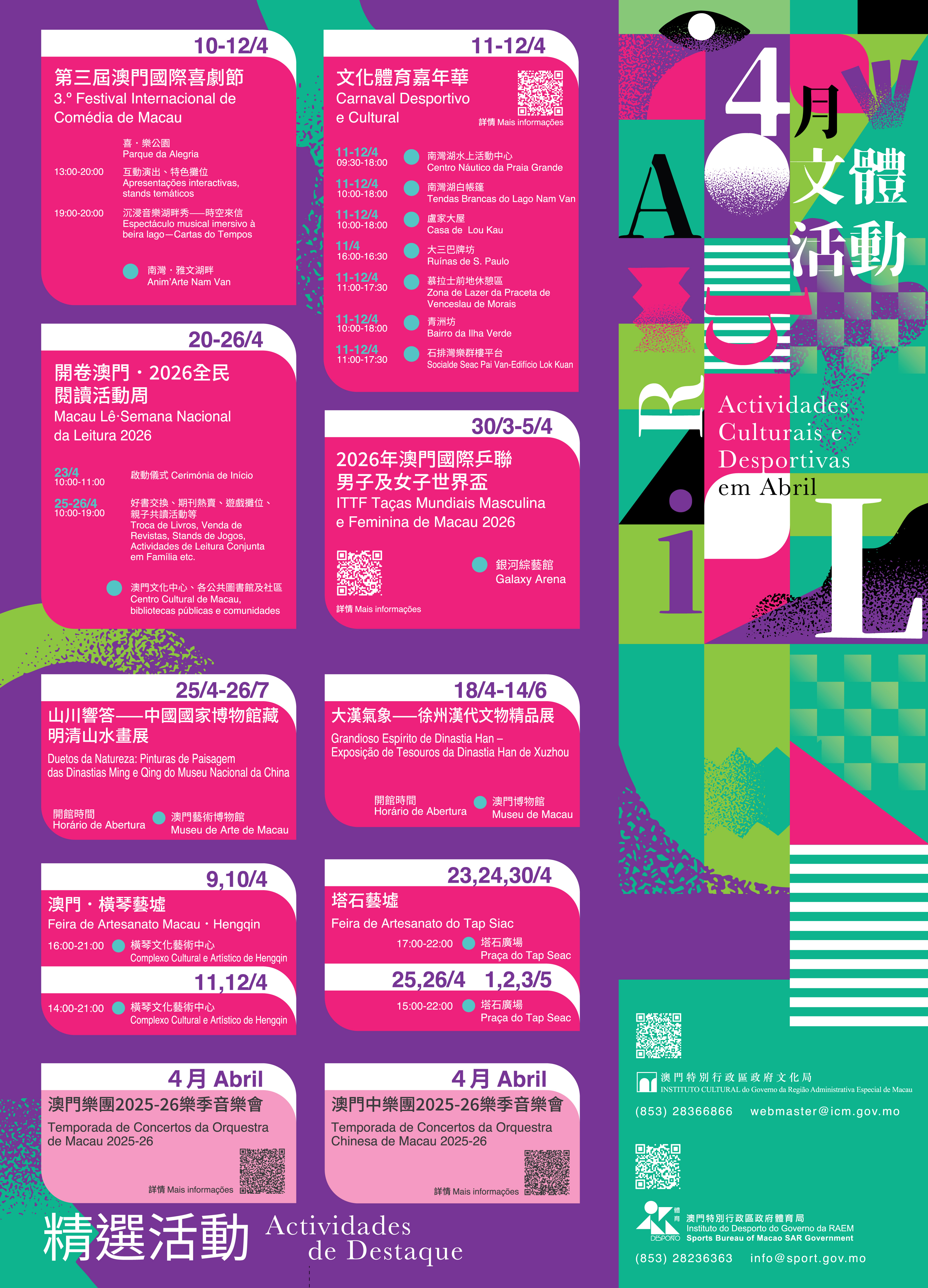 4月文體系列活動尚包括其他表演、展覽、工作坊、講座等,更多活動內容可瀏覽文化局網頁www.icm.gov.mo、Facebook專頁“IC Art 藝文棧”、微信公眾號“澳門文化局IC”及澳門活動網“享澳門”,或體育局網頁www.sport.gov.mo,關注Facebook專頁“澳門大眾體育動向”、微信公眾號“澳門體育”及微信訂閱號“澳門特區體育局”。