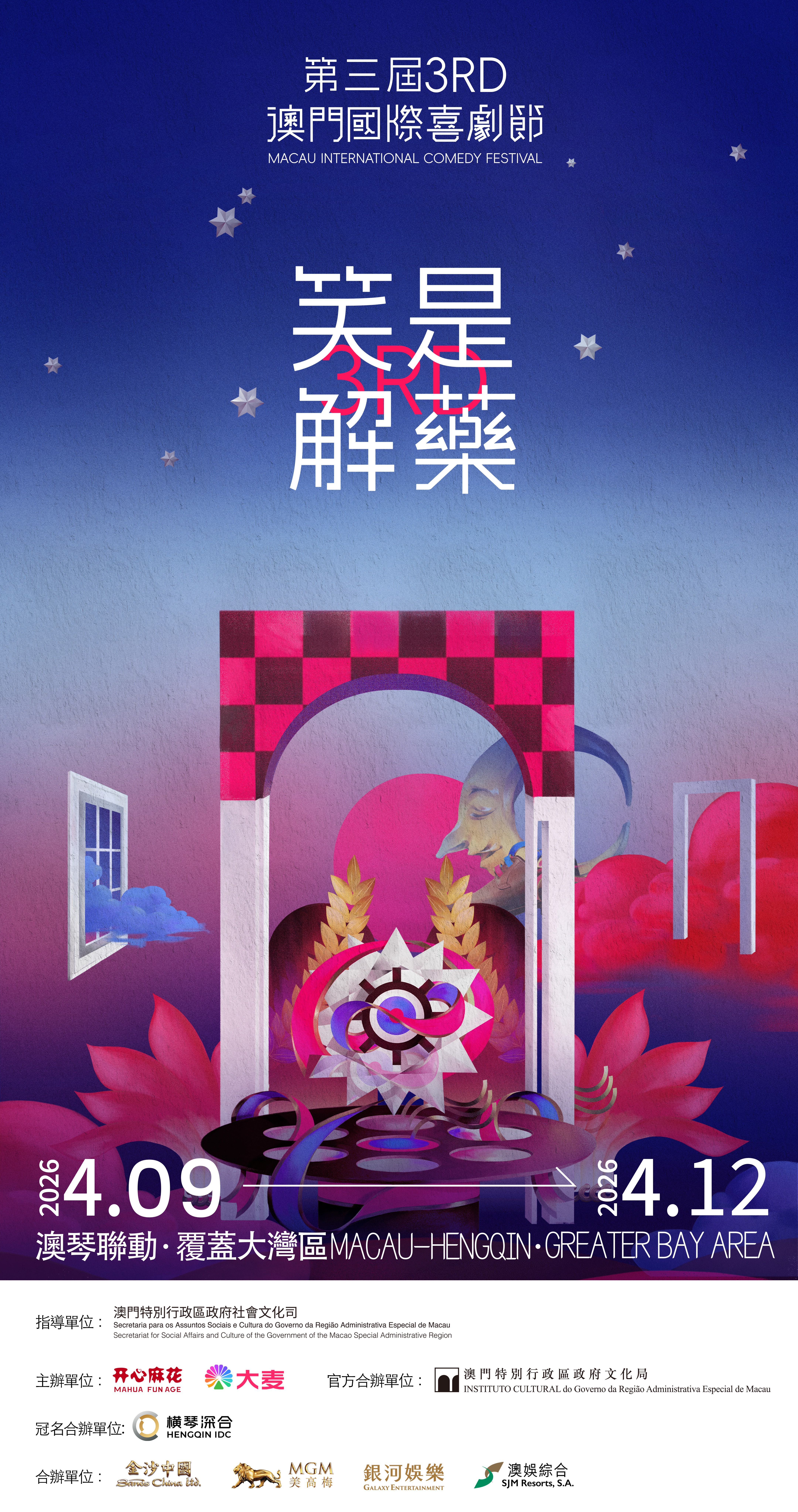 4月9日至12日,由社會文化司指導,開心麻花、大麥主辦、文化局官方合辦的第三屆澳門國際喜劇節將在澳琴兩地同步舉辦,獻演多元演藝節目,包括在南灣‧雅文湖畔推出與澳門歷史人物相關的“喜‧樂公園”演出,並邀業界明星擔任評審,於橫琴舉行澳門喜劇實訓班新秀選拔。