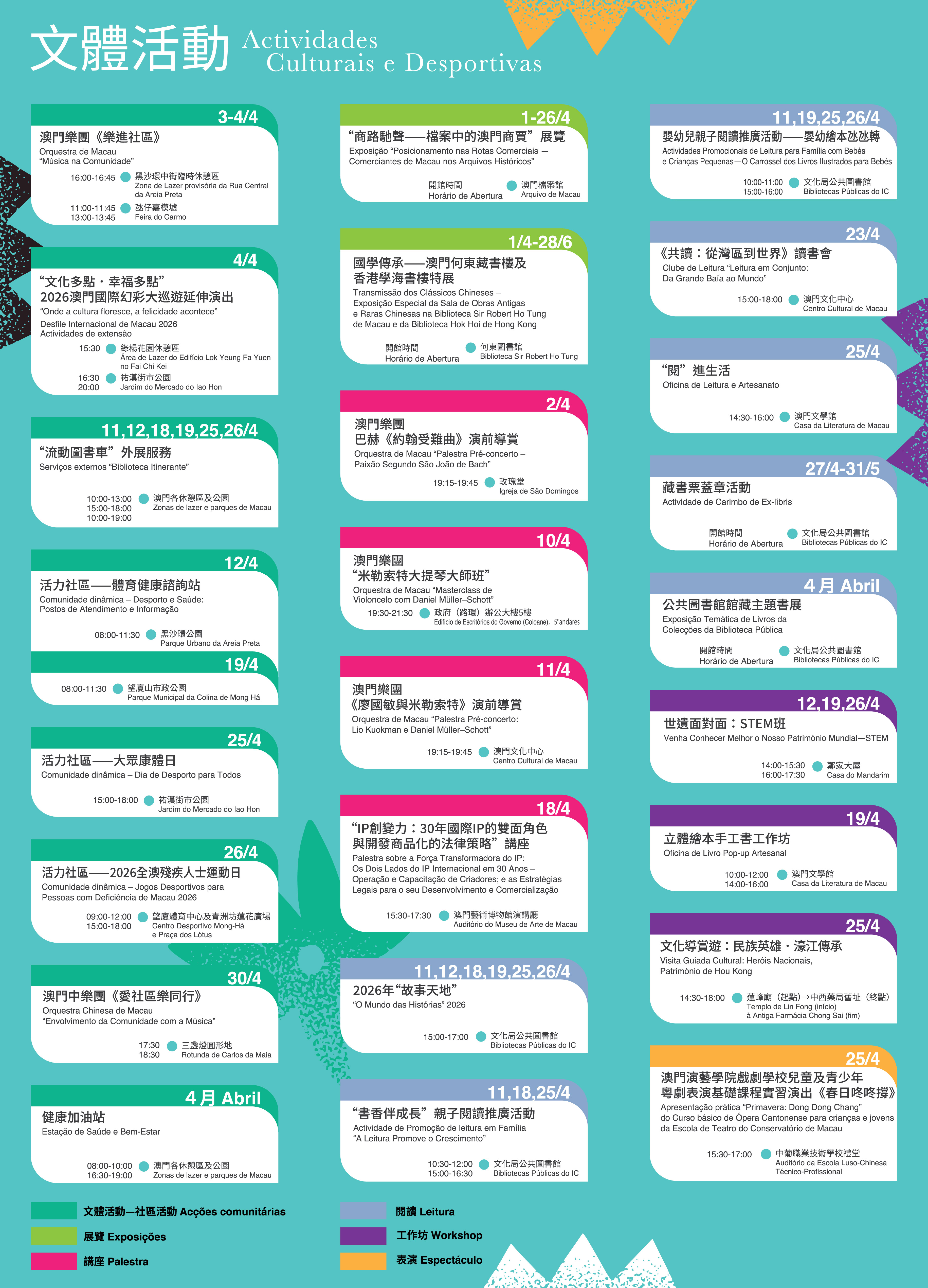 4 月期間將持續推出多場“文化多點‧幸福多點”社區活動,包括2026 澳 門國際幻彩大巡遊延伸演出、“流動圖書車”外展服務、澳門樂團《樂進社區》及澳門中樂團《愛社區樂同行》音樂會。由衛生局聯同文化局、體育局在澳門各休憩區及公園共同開展“健康加油站”活動,整合“文化滋養、科學運動、健康資訊”等三大元素,提供一站式服務深入社區。此外,還有多場“活力社區”活動包括“體育健康諮詢站”、“大眾康體日”及“2026全澳殘疾人士運動日”,以及多項閱讀推廣活動包括“故事天地”、“書香伴成長”親子閱讀推廣活動及嬰幼兒親子閱讀推廣活動“嬰幼繪本氹氹轉”等,將文體活動傳遞給不同需求的市民。